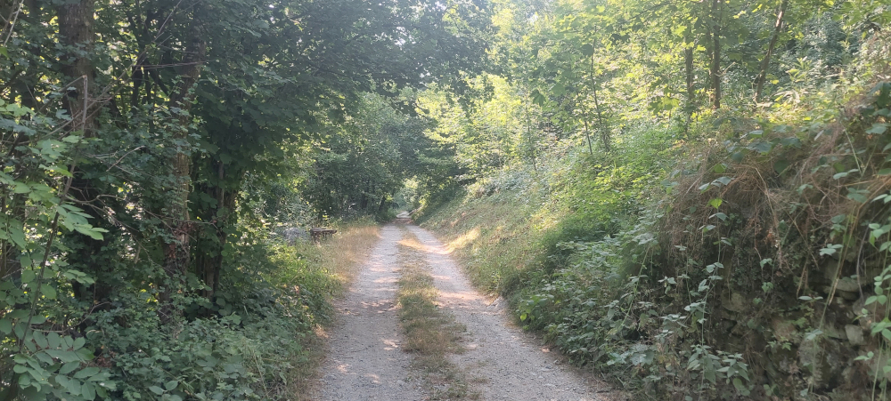 Zuerst führte der SI durch den Ort, wo ich mich noch an einem Wasserspender erfrischen konnte. Anschließend führte er leicht ansteigend durch einen Wald hinauf. Stellenweise wurde der Weg sehr steil. Viele verfallene Steinhütten standen am Wegesrand. Sogar ein verlassener Wohnanhänger. Irgenwann hatte ich den Bergrücken erreicht, doch der Laubwald blieb. Nun führte der Weg immerhin angenehmohne Steigung am Hang entlang.