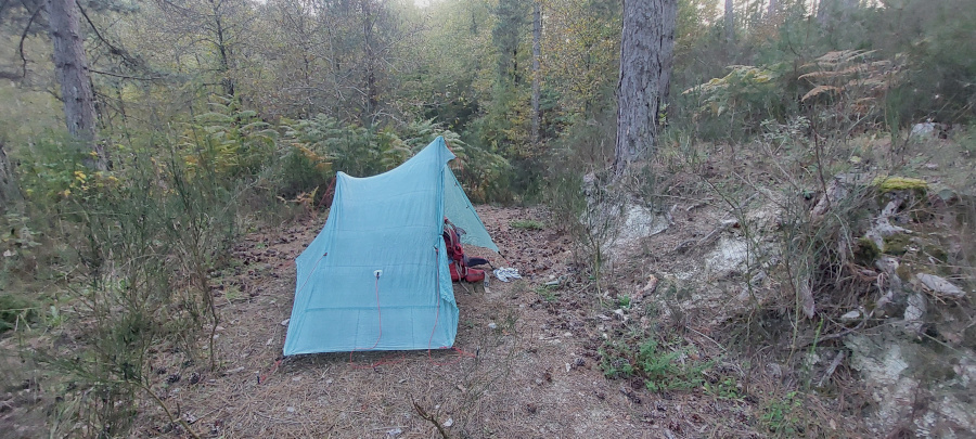 Die Zeltplatzsuche war schwierig, da fast überall dichtes Brombeergestrüpp wuchs. Ich lief hin- und her, schaute hier und dort und fand schließlich einen flachen Erdboden unterhalb von ein paar Fichten. Diesmal war ich bloß 23.5km gelaufen.