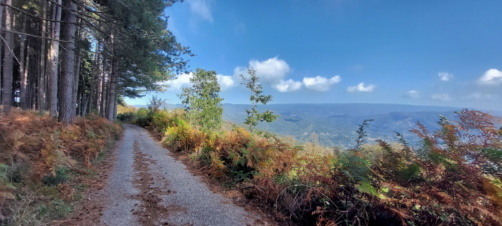 Hinter Pedace wechselte der SI auf einen schmalen Pfad, der im späteren Verlauf in einen breiten Forstweg überging. Autos begegneten mir aber keine. Beständig ging es bergauf, zuerst durch Kiefernwald und zum Schluss des 1500hm-Anstiegs durch wunderschön gelb gefärbten Buchenwald.
